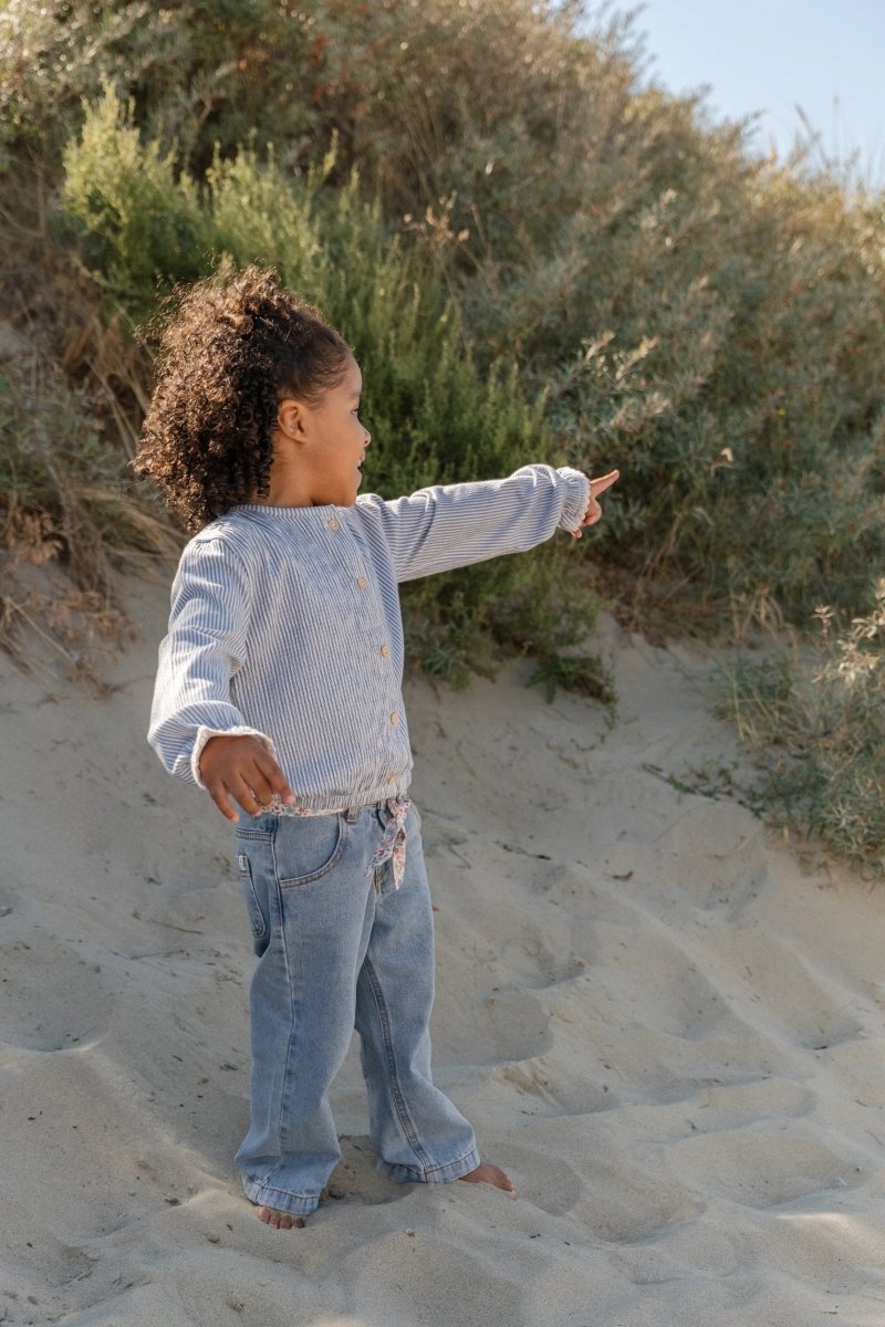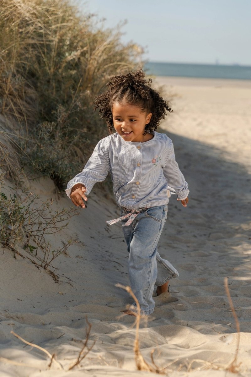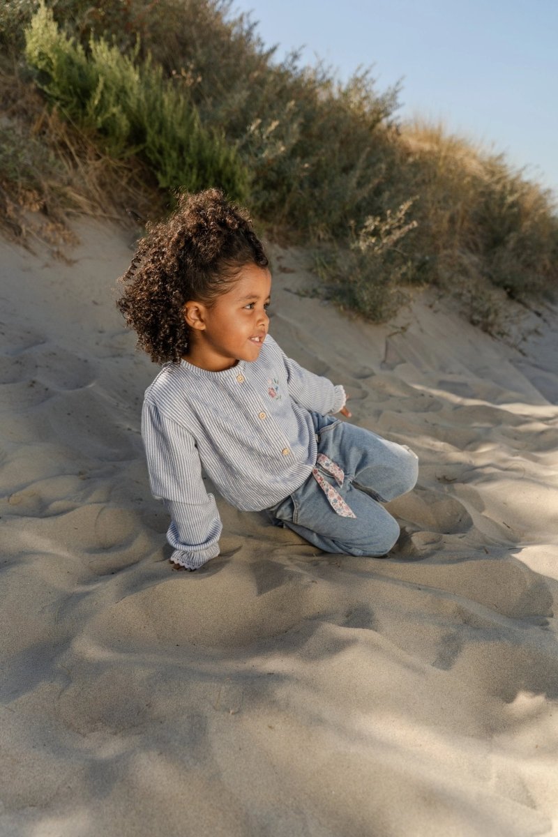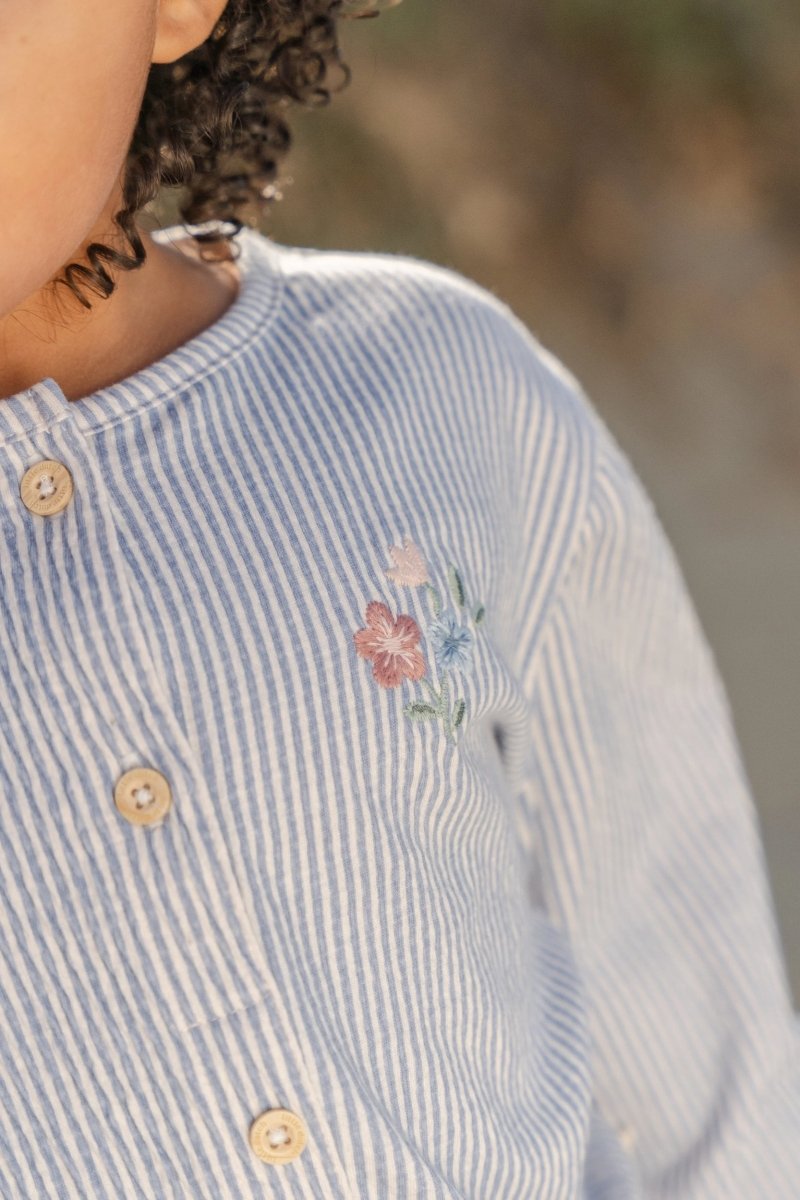 Knapperne i trælook foran gør det nemt at tage blusen af og på. De elastiske ærmer med flæser giver et legende touch, mens de fine broderede blomster på brystet giver en sød detalje. Den elastiske bund sikrer en god, behagelig pasform. Fremstillet af økologisk bomuld og Oeko-Tex-certificeret - for et sikkert og ansvarligt valg hver dag. En alsidig favorit til endeløse øjeblikke sammen.