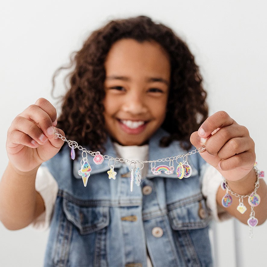 Lav de sødeste armbånd med enhjørningecharms med dette komplette smykkesæt. Vælg dine yndlingscharms, bl.a. enhjørninger, diamanter, regnbuer og poopsie, og sæt dem på armbåndet. Vil du skifte charms senere? Du kan nemt tage dem af og sætte dem på igen, så du har et armbånd efter din smag hver gang.