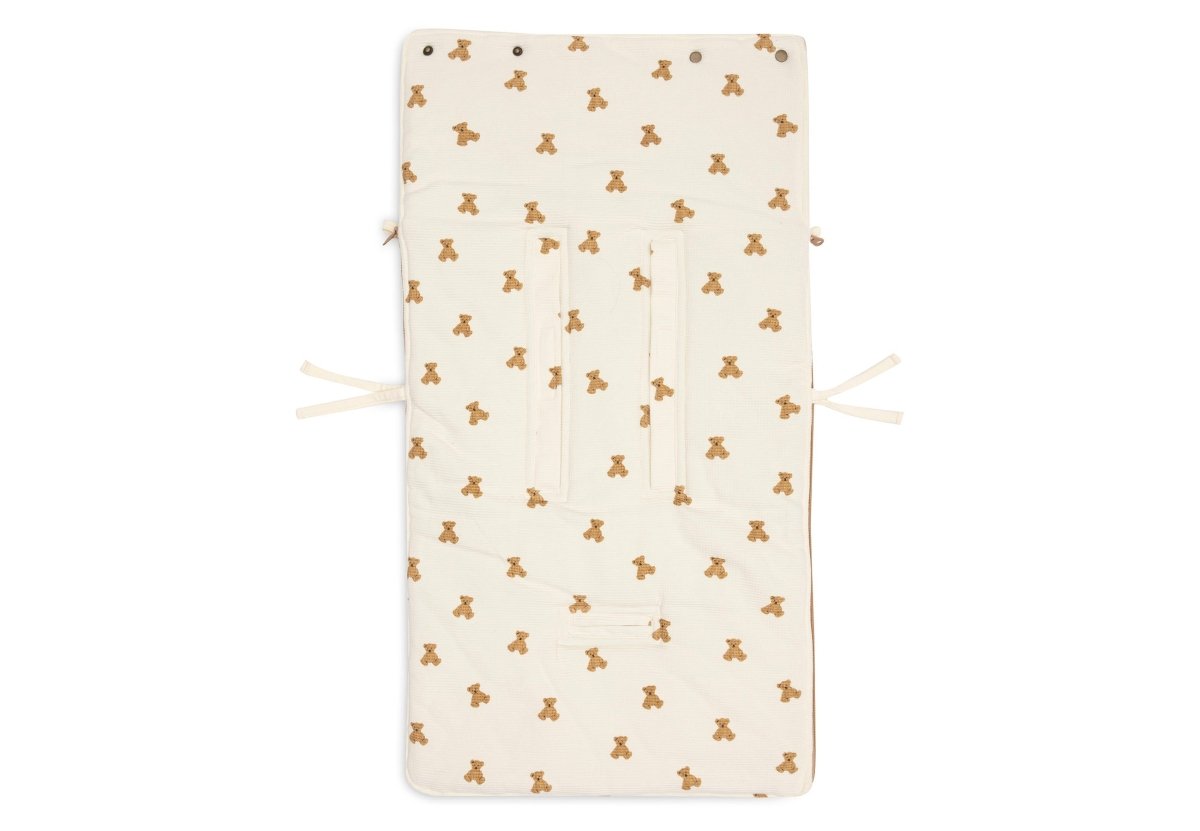 Om dette produktDen allerbedste ven er tilbage, nu i miniudgave! Denne fodpose har et mønster med små teddybjørne overalt på en rolig baggrund, hvilket giver en blød og tryg fornemmelse på farten. Fodposen passer til både 3- og 5-punktsseler og passer derfor til de fleste gruppe 0+ autostole og barnevogne. Sørg for, at fodposen sidder godt, så dit barn sidder sikkert og komfortabelt fast. Takket være lynlåsene kan du nemt åbne og lukke soveposen, så du hurtigt kan putte dit barn ind eller tage det ud. Perfekt til kolde dage: dit barn forbliver altid varmt og hyggeligt.