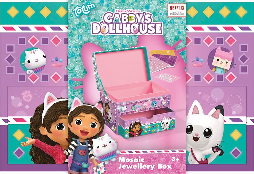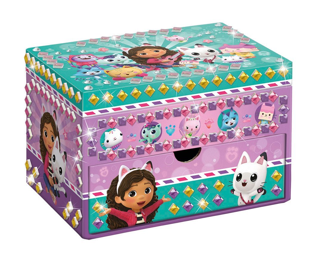 Dekorer dit eget smykkeskrin i et muntert design af Gabby's Dollhouse og alle hendes venner! Hvad der er endnu sjovere ved dette smykkeskrin: Du kan selv bestemme, hvordan det skal se ud! Dæk æsken med de selvklæbende metalliske skumblokke og selvklæbende rhinestones. Nu har du alle dine smykker samlet i et smukt hjemmelavet smykkeskrin.