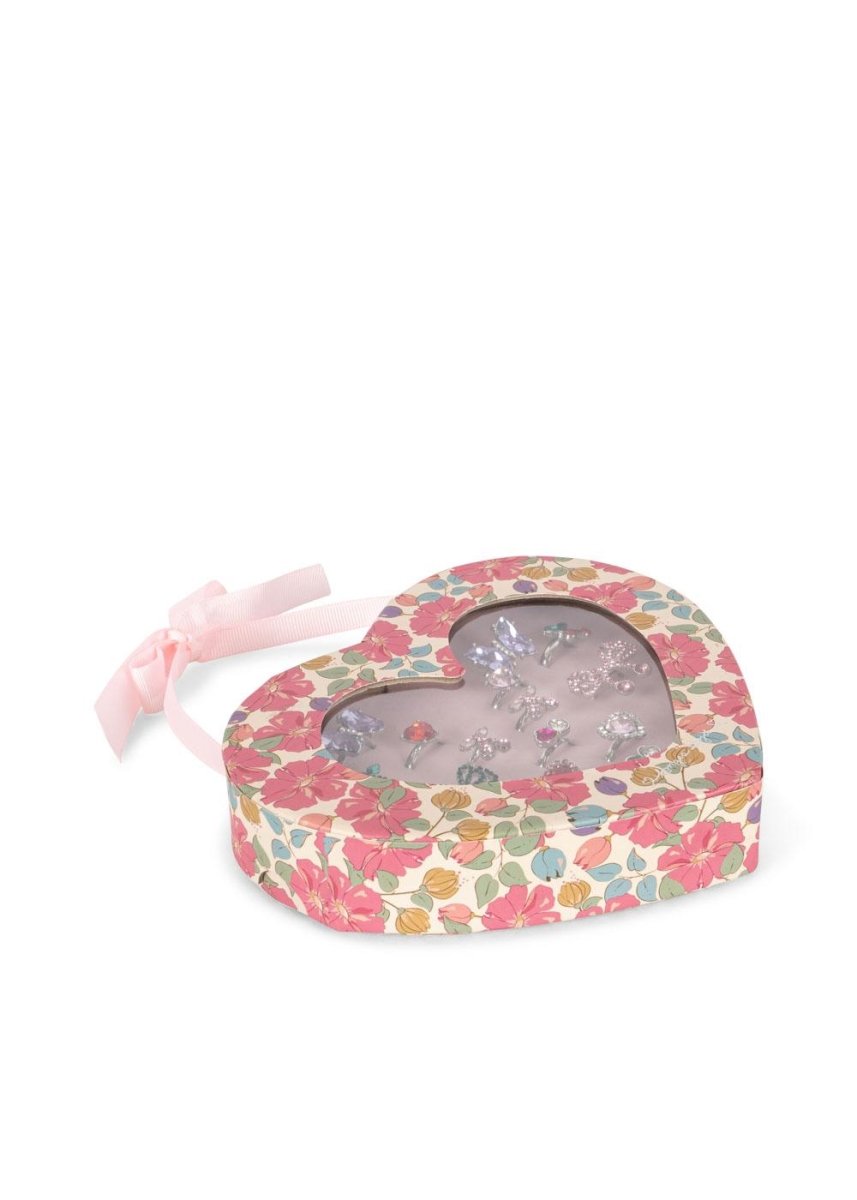 Justerbare fingerringe til børn med Konges Slojds karakteristiske, drømmende design. Dette sæt består af 14 forskellige ringe med legende former og farver, der er perfekte til at mikse og matche. Ringene leveres i en smuk, hjerteformet gaveæske - ideel til pæn opbevaring eller til at give i gave.