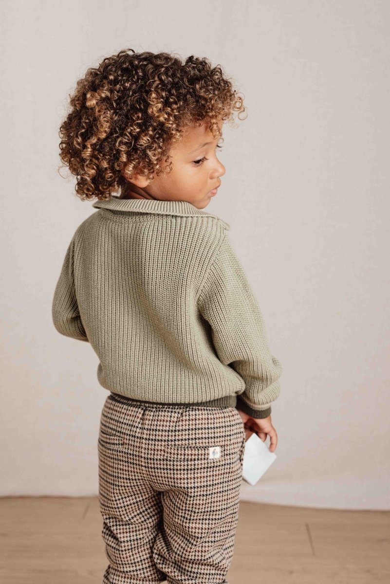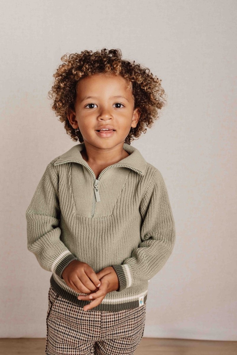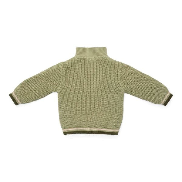 Denne strikkede trøje i en naturlig grøn nuance er fremstillet af økologisk bomuld og har en cool lynlås ved kraven. Kontrastfarvede striber forneden og på ærmerne giver trøjen et moderne og legende touch. Alle varer i Farm-kollektionen er nøje afstemt efter hinanden, så du kan mikse og matche i det uendelige. Fås i størrelserne 74, 80, 86, 92, 98 og 104