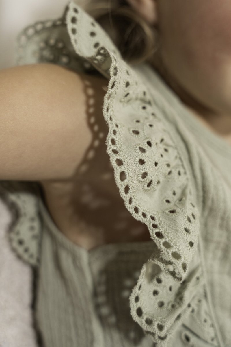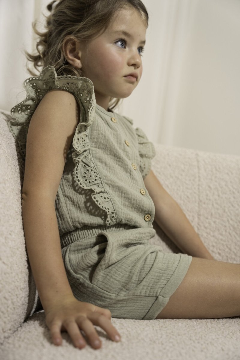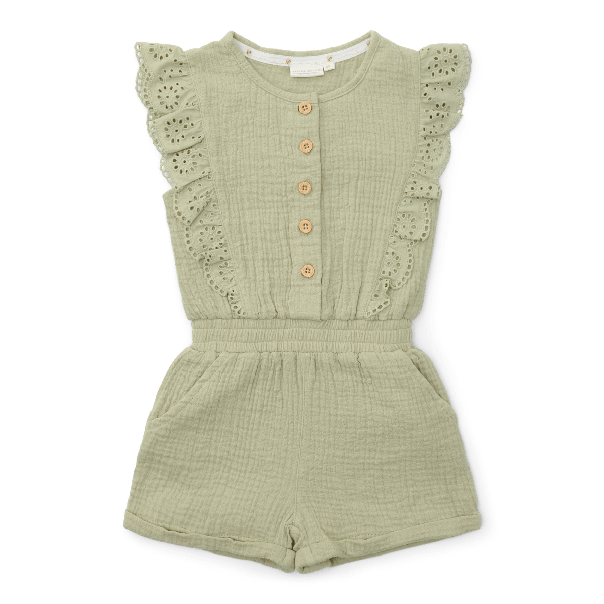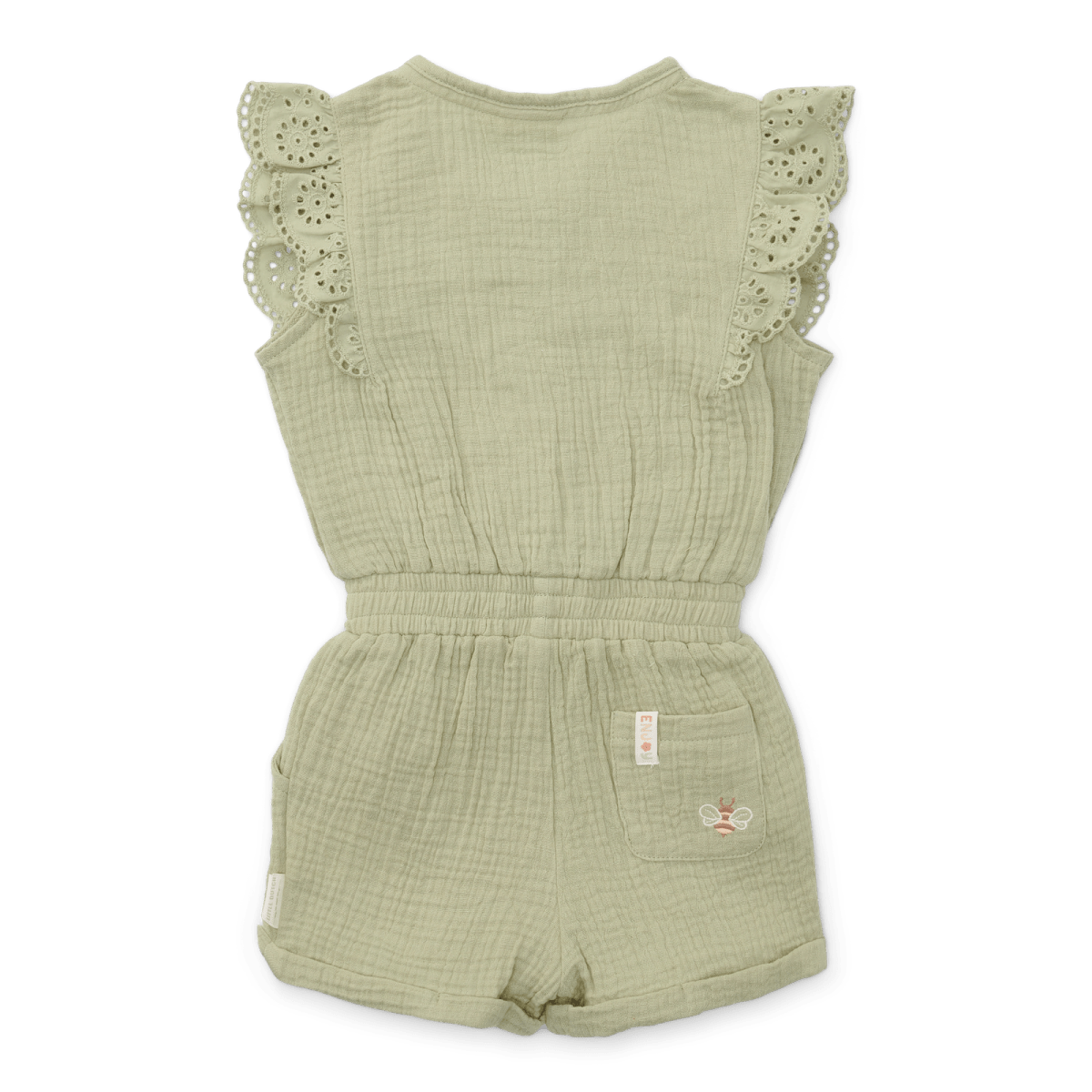 Denne muntre grønne muslin-jumpsuit af økologisk bomuld er dejlig blød og luftig at have på. Den elastiske linning gør jumpsuiten nem at tage af og på. Jumpsuiten er beriget med søde broderiflæser, et muntert broderi på baglommen og fine knapper i trælook.