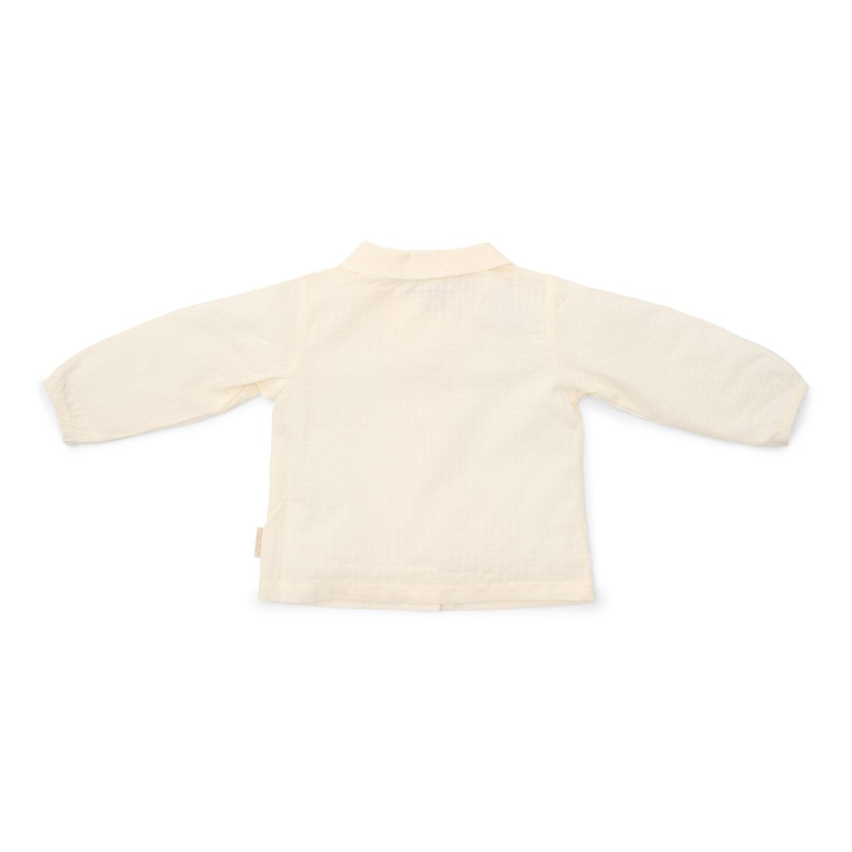 Lad din fantasi blomstre! Denne fortryllende cremehvide langærmede bluse er både elegant og alsidig. Det lette stof med et struktureret prikmønster er udsmykket med fine detaljer, som gør den ekstra sød. Blusen er fremstillet af økologisk bomuld og lukkes med en række knapper i trælook, herunder en iøjnefaldende knap i form af en blomst. Kanten er afsluttet med en diskret flæse, som fremhæver blusens søde og legende look.