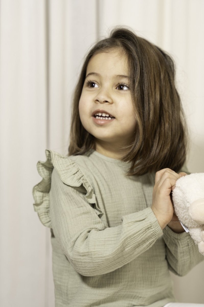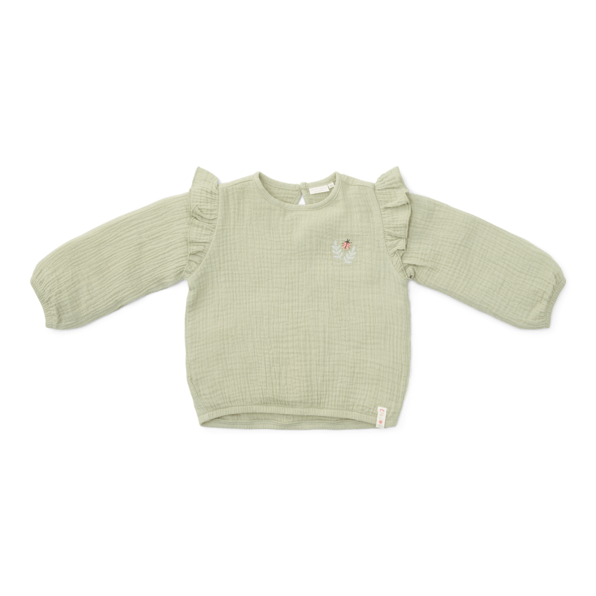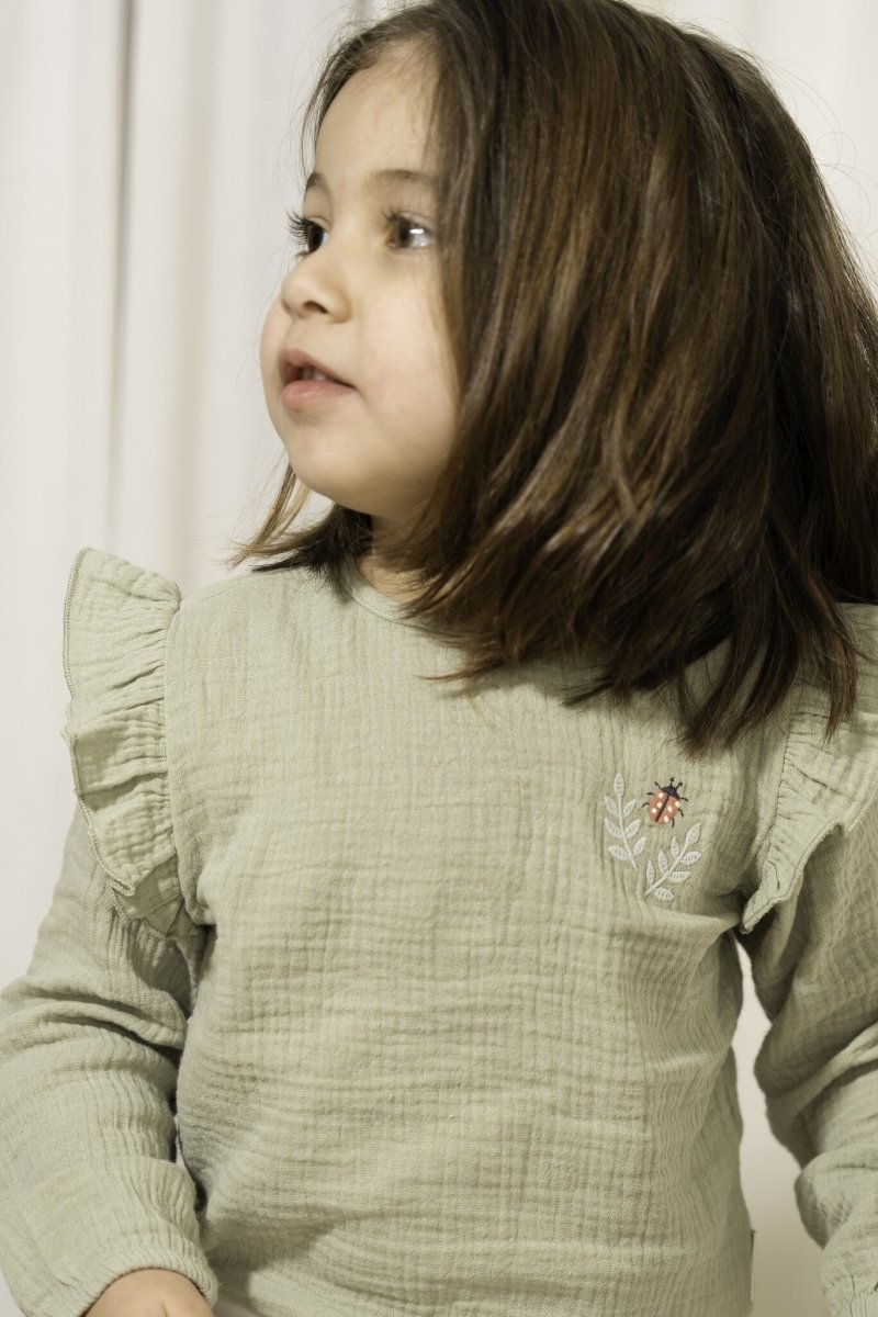 Denne vidunderligt bløde muslinbluse har lange ærmer og en behagelig pasform. Den er lavet af økologisk bomuld, som er dejligt blødt for dit barns hud. Den friske grønne farve og broderiet på brystet vil gøre dig i godt humør! Blusen har elastiske manchetter for en god pasform, og der er en elastisk knaplukning bagpå, så den er nem at tage af og på