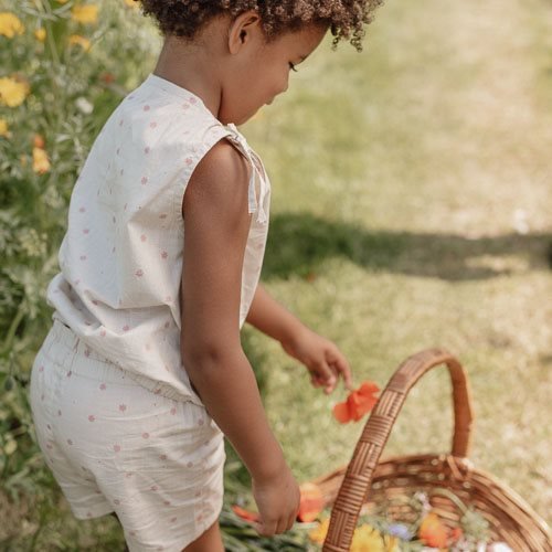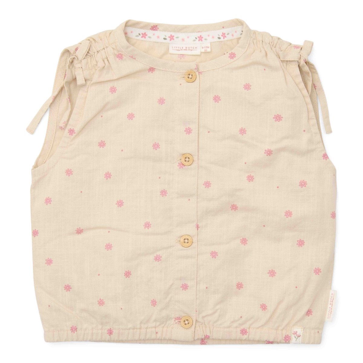 Træd ind i en blomsterhave, hvor fortryllelsen lurer i hvert kronblad, og luften er fyldt med den søde duft af naturlig skønhed. Denne charmerende bluse uden ærmer i sandfarvet hørlook er dekoreret med søde lyserøde blomster, som giver et romantisk touch. Smockede skuldre og fine sløjfer udstråler elegance og legesyge, mens knaplukningen foran tilføjer et strejf af raffinement. En elastisk kant sikrer en behagelig og flatterende pasform.