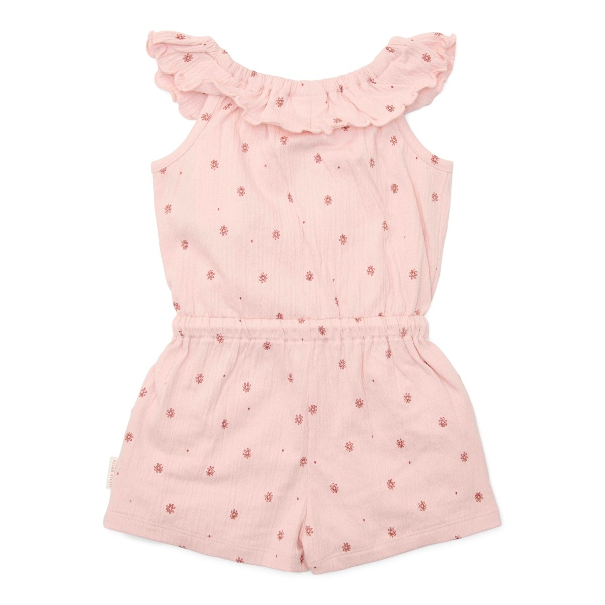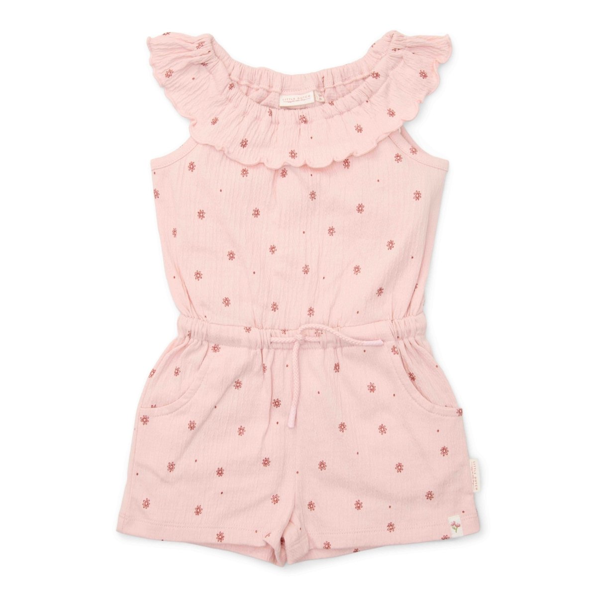 Leg og strål i lotusrosa denne sommer! Denne jumpsuit er den perfekte heldragt til små eventyrere. Den er lavet af behageligt, krøllet stof med stretch og sikrer bevægelsesfrihed og komfort hele dagen. Det charmerende blomstermønster og flæserne ved halsudskæringen gør tøjet ekstra sødt. Den elastiske halsudskæring og talje gør det nemt at tage tøjet af og på, og snoren i taljen gør det muligt at justere pasformen. Jumpsuiten er fremstillet af økologisk bomuld og har praktiske sidelommer til små fund.