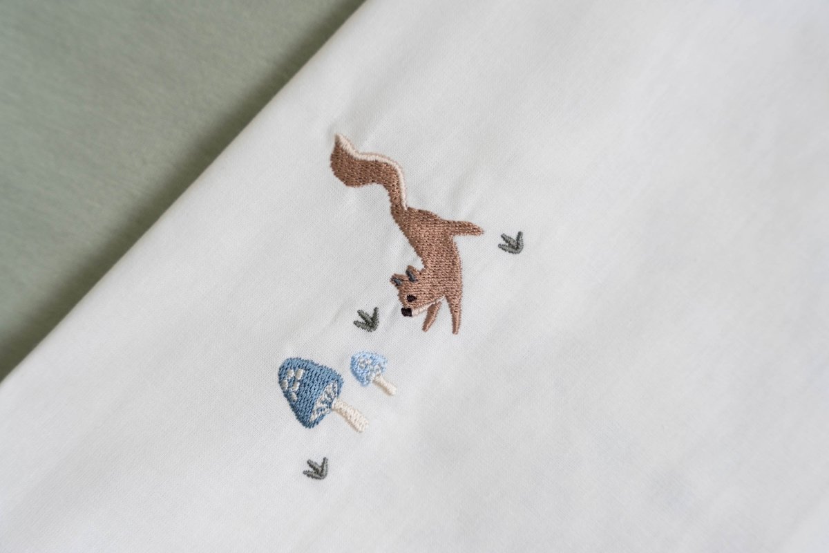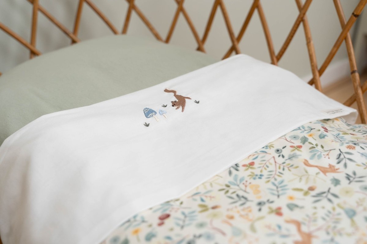 Giv dit barns værelse et strejf af atmosfære med dette sengelagen med broderede svampe fra Forest Friends-kollektionen. Lagnet er lavet af 100 % økologisk bomuld og sikrer, at dit barn har det behageligt og kan drømme sig væk. Den dekorative kant har et sødt svampebroderi. Fold blot lagnet over et Little Dutch tæppe for at tilføje et ekstra lag varme og stil til tremmesengen.