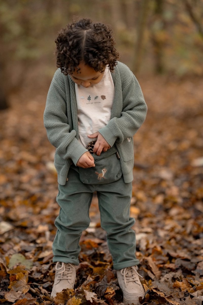 Beskrivelse Anmeldelser Om dette produkt Hoftepose af fløjl, lynlås foran, Forest Friends-broderi foran, justerbar rem, der kan løsnes og strammes med et spænde, fremstillet af økologisk bomuld, Oekotex-certificeret. 98 % bomuld/2 % elastan Trustpilot