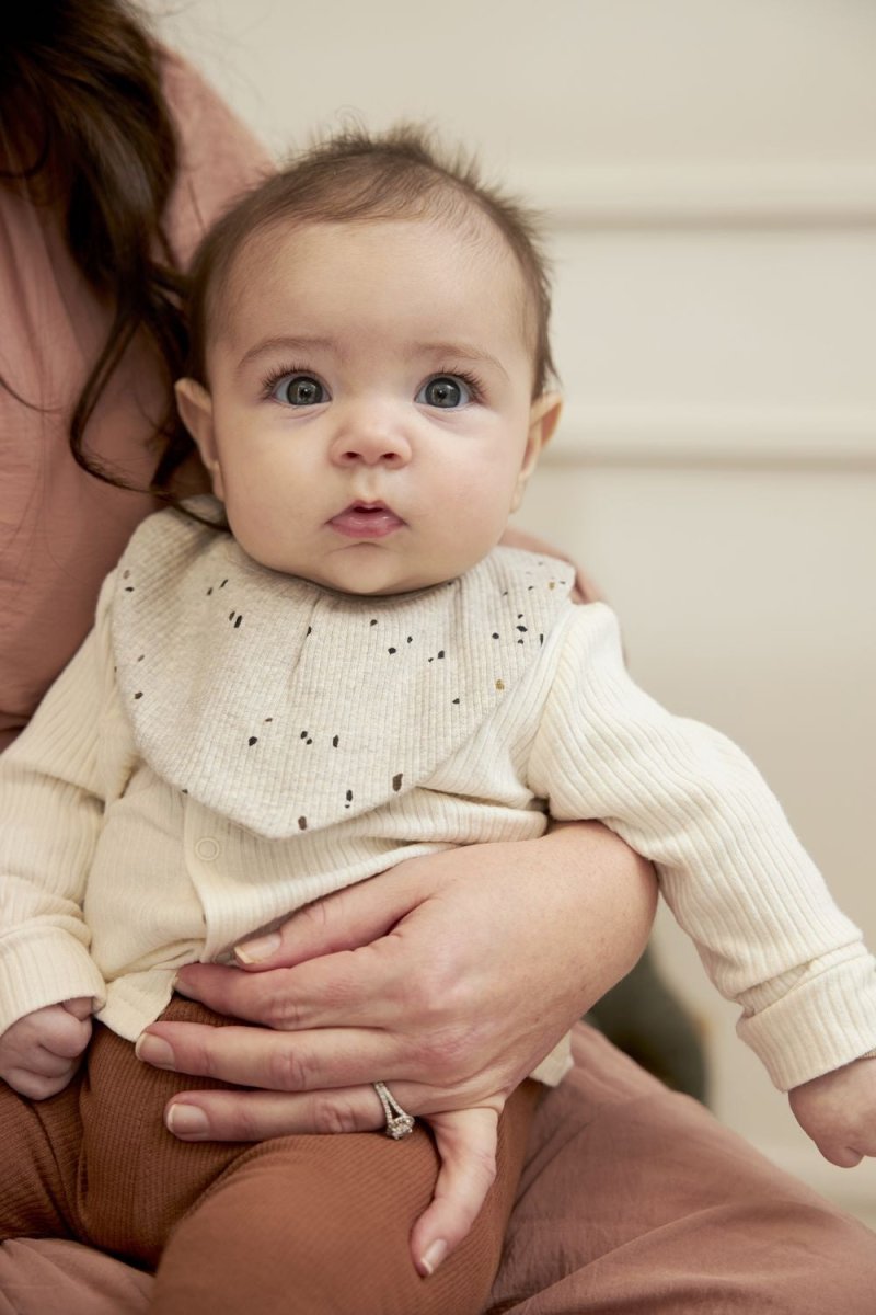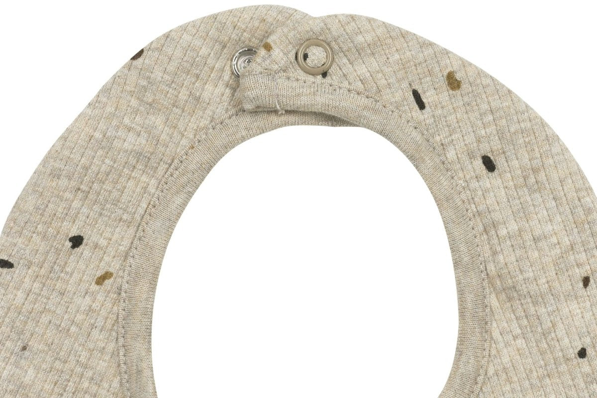 Bandana-hagesmækkene er lavet af 95 % blød bomuld og 5 % elastan. Det trendy ribstof giver et sjovt twist, og stoffet er dejligt blødt og elastisk. Hagesmækkene fås i forskellige melangefarver og har Mini Spot-print. Printet er minimalistisk, men giver alligevel bandanaen et meget elegant look, og du kan nemt kombinere den med hele dit babyoutfit.
