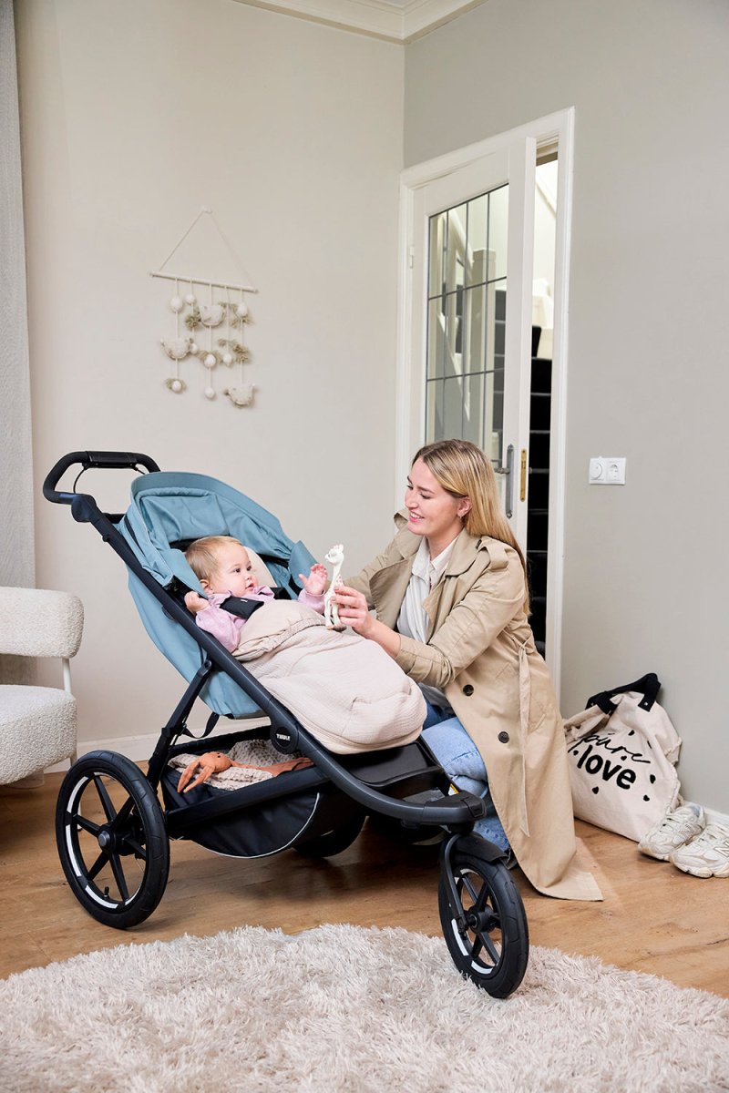 - Barnevognsindsatsen absorberer fugt godt, hvilket er ekstra behageligt på varme dage