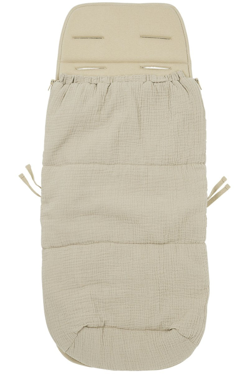Fodposen er lavet af 100 % forvasket hydrofilt bomuld, hvilket gør den dejlig blød at røre ved og åndbar. Det lette fyld er lavet af 100 % polyester. Posen kan nemt åbnes og lukkes med en lynlås. Og hvis det bliver for varmt, kan du bare lyne den op eller tage toppen helt af, så du kan bruge bunden som barnevognsindsats. Praktisk, ikke sandt?