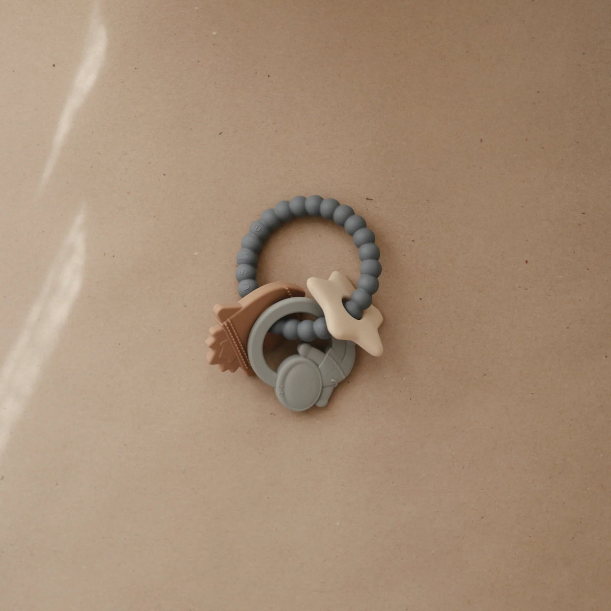 Introducer din baby for vores bidering, der giver komfort, støtte og lindring. Det bløde, men holdbare materiale er lavet af 100 % silikone og imødekommer barnets naturlige trang til at tygge, med strukturerede måne- og stjerneformer rundt om ringen. Charms med astronauter, stjerner og raketter skaber overjordiske legemuligheder for de små, efterhånden som deres sensoriske udvikling skrider frem