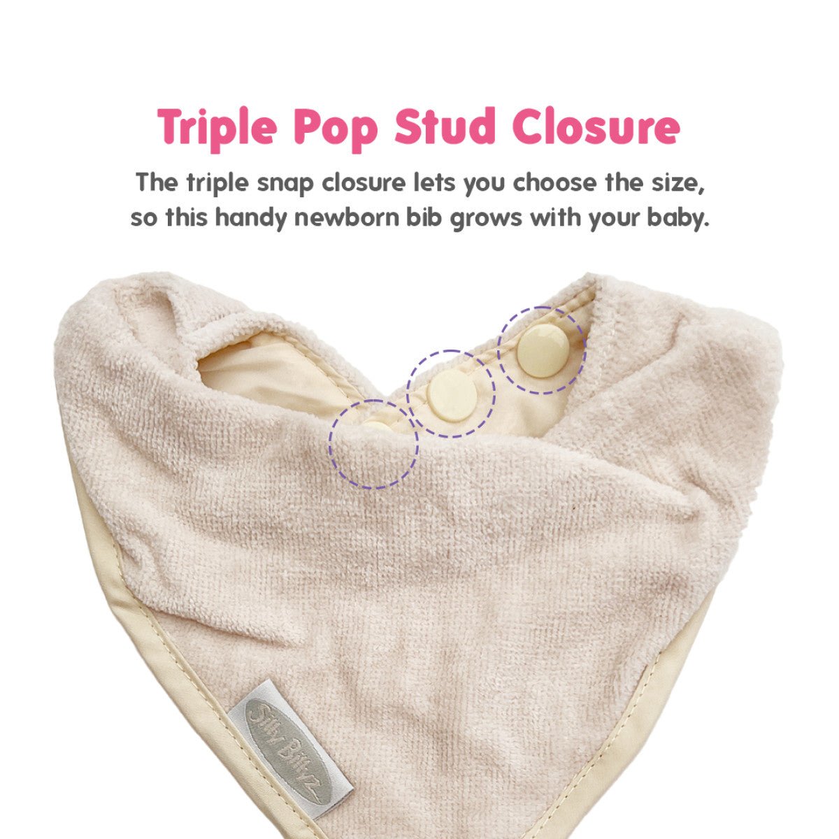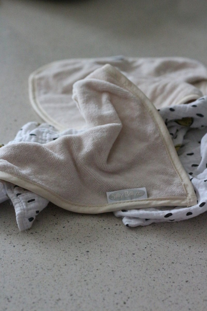 Denne Silly Billyz Bandana Bib i farven White Sand er perfekt som den første hagesmæk til den lille. Det bløde og absorberende stof holder følsom hud tør, hvilket især er godt for babyer med eksem. Den vandtætte nylonbagside beskytter tøjet mod fugt og pletter og holder det pæne tøj rent. Takket være den justerbare trykknaplukning på 3 tommer vokser hagesmækken nemt med din baby. Desuden er denne hagesmæk PVC-fri og nem at vedligeholde.