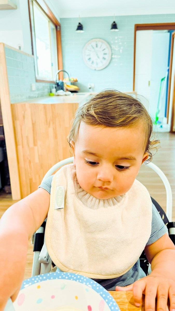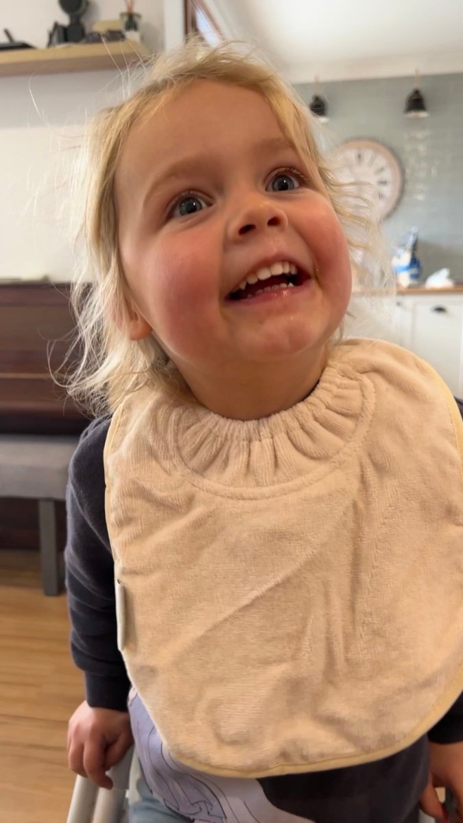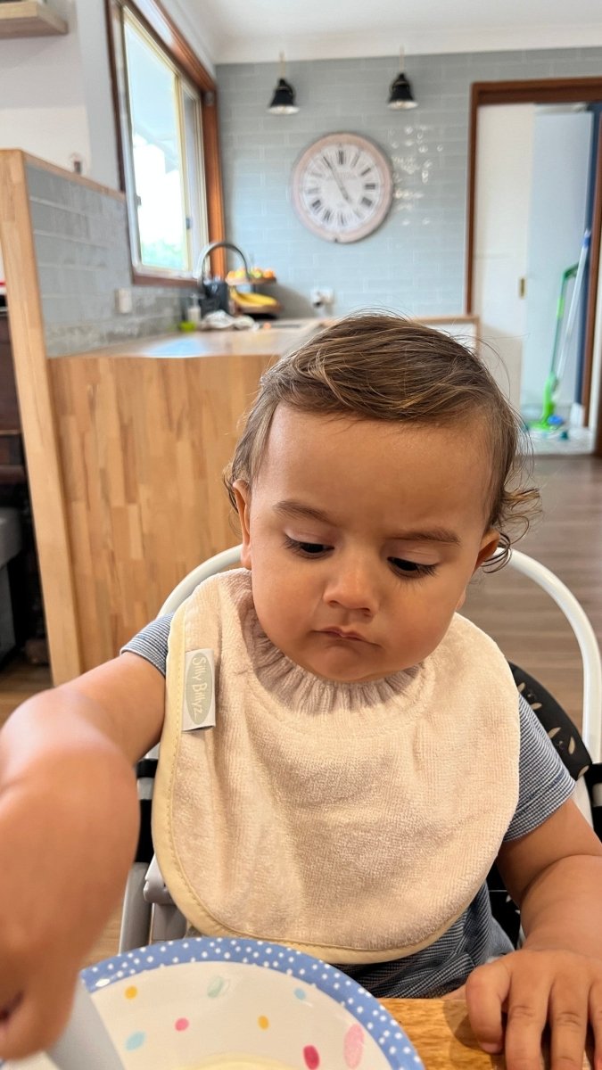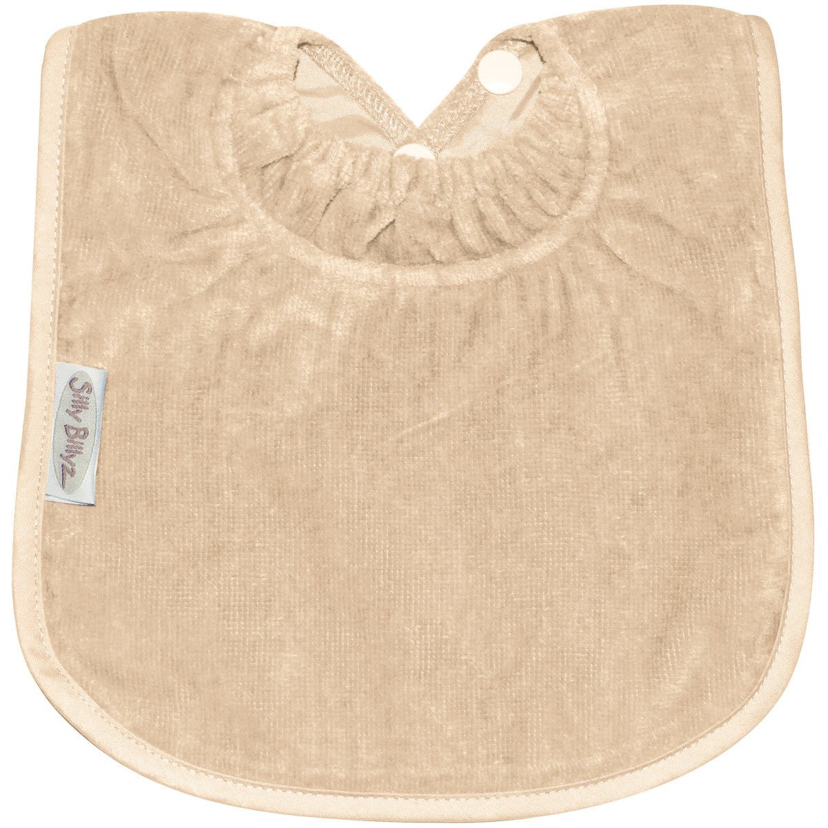 Silly Billyz Plain Large Bib i White Sand er ideel til småspisere og passer til babyer fra omkring 3 måneder. Denne hagesmæk kombinerer en smudsafvisende bomuldsforside med en åndbar, vandtæt nylonbagside uden PVC, så tøjet forbliver tørt. Den praktiske lomme til opsamling af hagesmæk fanger krummer og madrester og er vendbar, når du ikke vil bruge den.