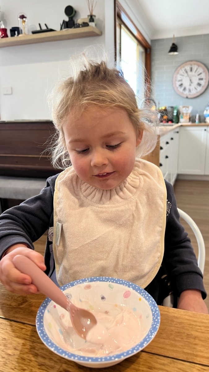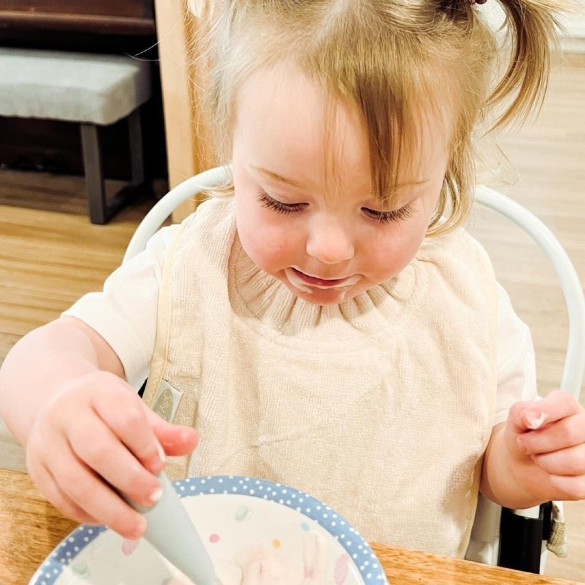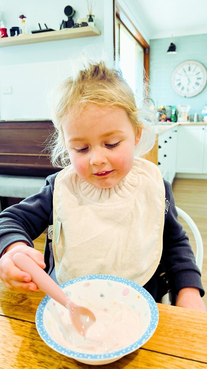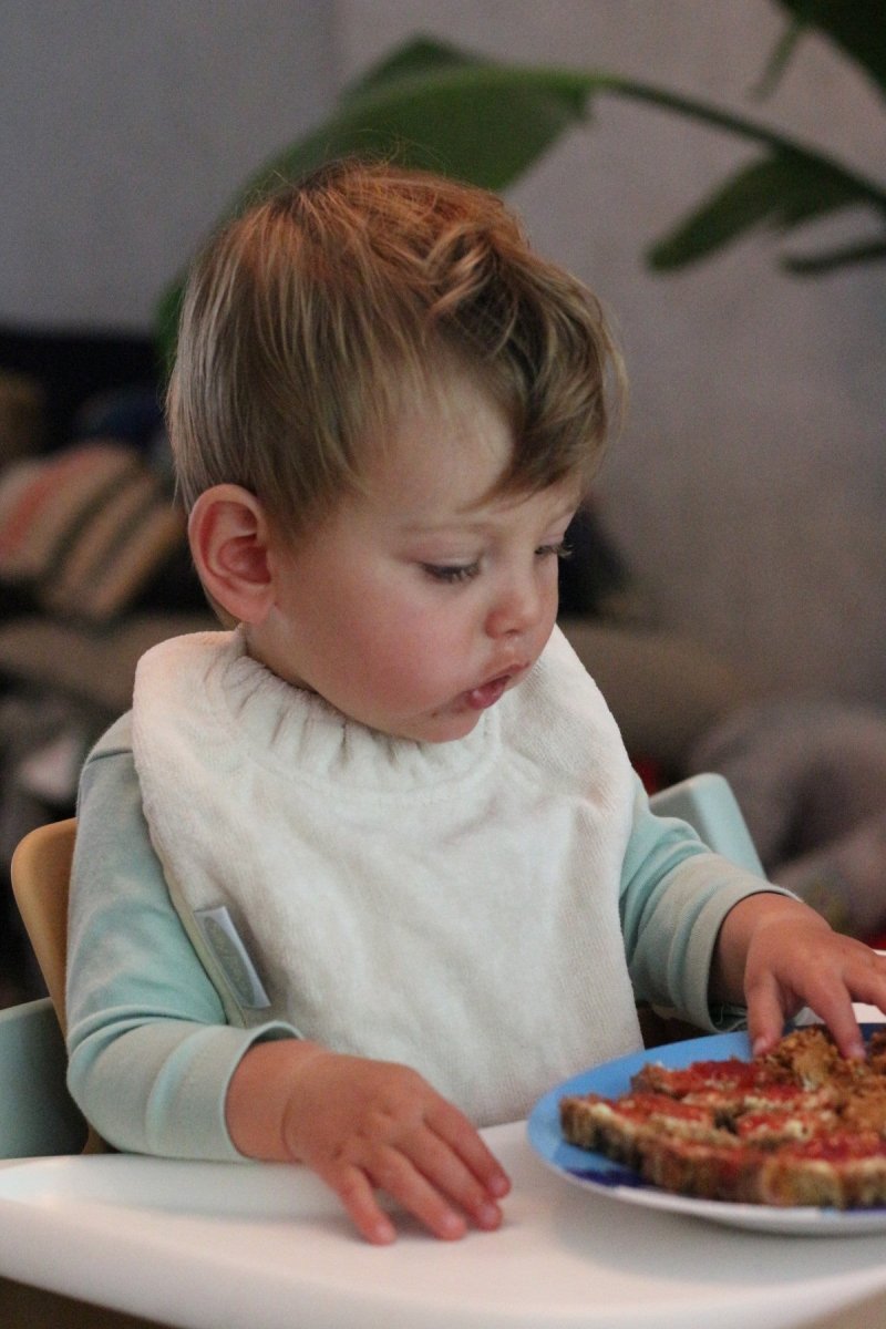 Silly Billyz Plain Large Bib i White Sand er ideel til småspisere og passer til babyer fra omkring 3 måneder. Denne hagesmæk kombinerer en smudsafvisende bomuldsforside med en åndbar, vandtæt nylonbagside uden PVC, så tøjet forbliver tørt. Den praktiske lomme til opsamling af hagesmæk fanger krummer og madrester og er vendbar, når du ikke vil bruge den.