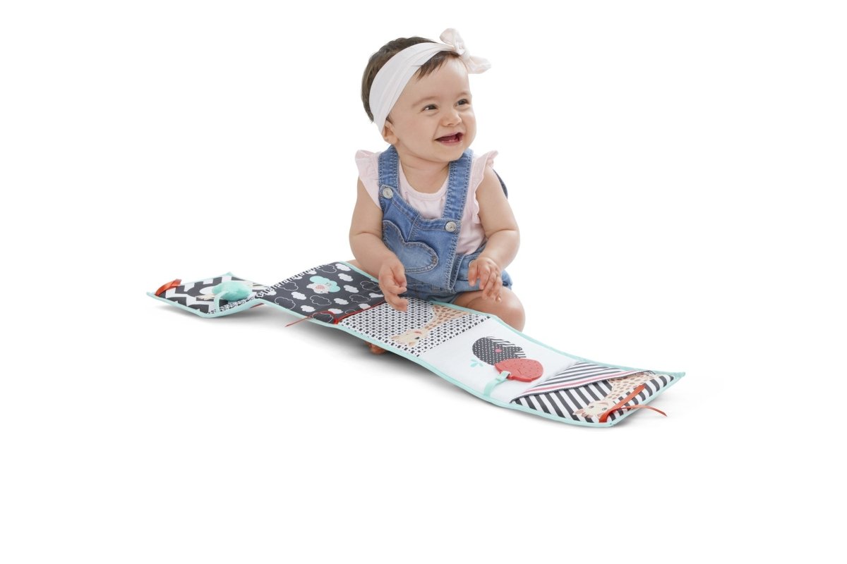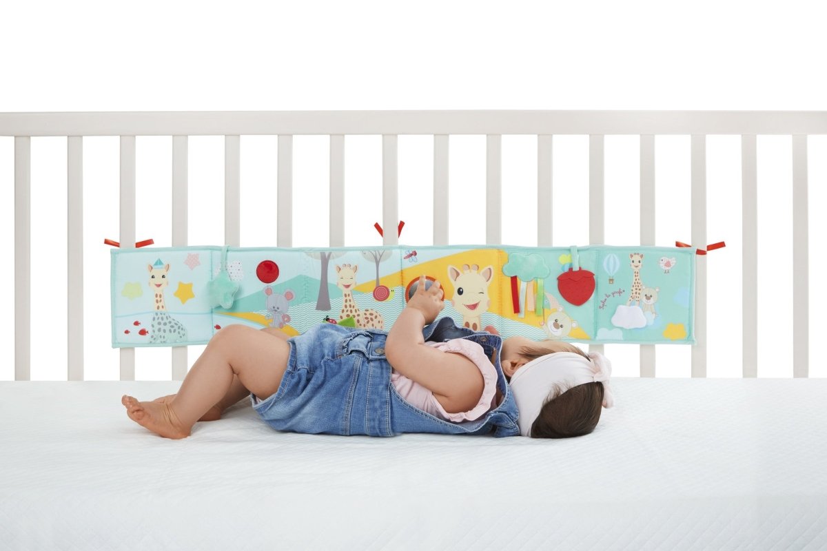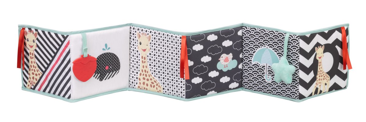 Sophie de Giraf En foldbar legebog, der stimulerer dit barns sanser! Indeholder 12 illustrerede sider med mange aktiviteter: Levende og kontrasterende farver; bånd og forskellige materialer at føle på; krøllet papir; et spejl; en bidering; klokker. Bogen kan hænges op på sengen eller kravlegården takket være de 6 ophængningssnore. Velegnet fra 0 måneder. Tørres af med en fugtig klud.