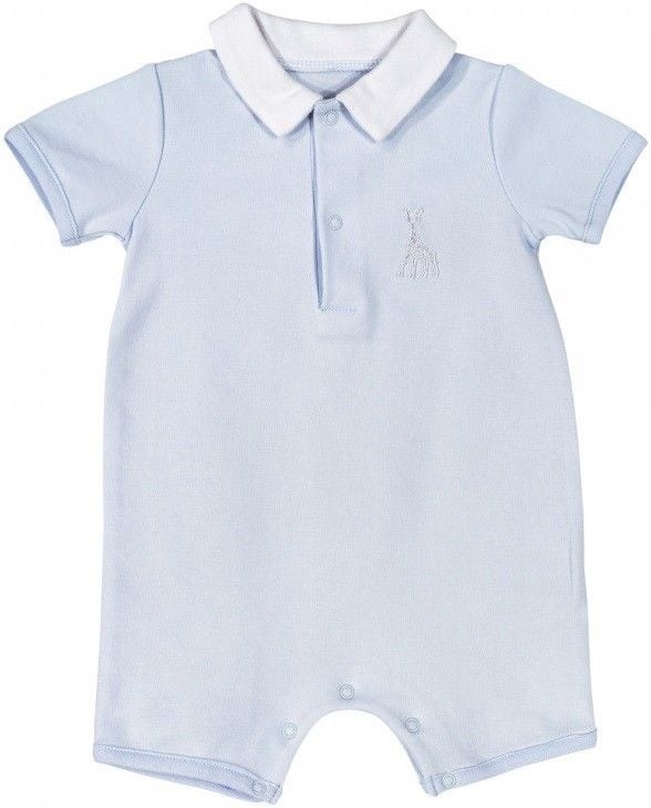 Sophie de Giraf Dit barn vil se bedårende ud i denne 1-delte dragt fra Sophie de giraf! Dragten er blå og har korte ærmer og en hvid krave. Takket være trykknapperne bagpå og ved benene kan du nemt give dit barn dragten på og tage den af igen. Størrelser: 3 måneder: 60 cm; 6 måneder: 67 cm; 12 måneder: 80 cm. Materiale: 100 % bomuld; Vaskeanvisning: vaskes på vrangen ved 30 grader med lige farver; Mærke: Trois Kilos Sept.