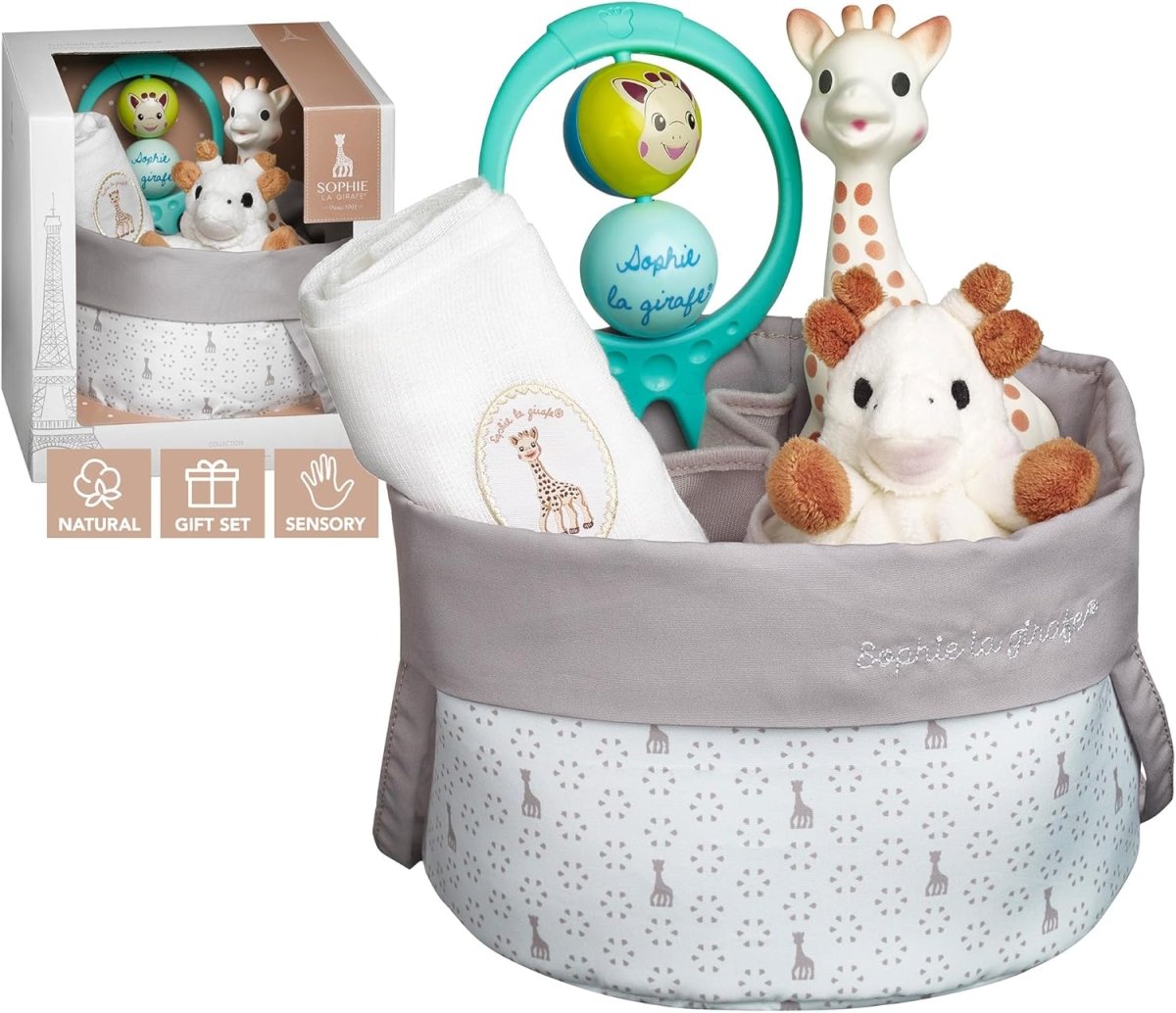 Fejr den lille nys fødsel med denne luksuriøse Sophie de Giraf fødselskurv - den perfekte barselsgave! Denne stilfulde gaveæske med 5 dele indeholder nøje udvalgte babyprodukter fra Sophie de Giraf, fremstillet af sikre materialer af høj kvalitet som naturgummi og bløde stoffer. Alt er pakket i en smuk opbevaringskurv, som også er praktisk til babyens værelse.