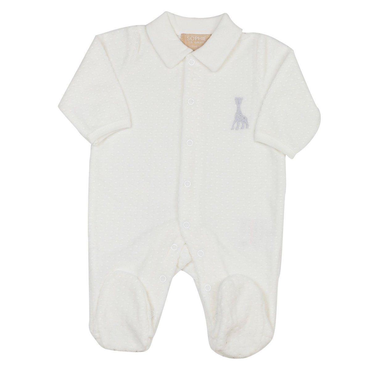 En blød og sød Sophie de giraf legedragt! Denne fløjlsjacquarddragt er hvid og har lange ærmer, fødder og en krave. Trykknapper i fuld længde op til fødderne gør det ekstra nemt at skifte tøj. Størrelser: 0 måneder: 50 cm; 1 måned: 54 cm; 3 måneder: 60 cm. Materiale: 75 % økologisk bomuld og 25 % polyester. Vaskeanvisning: Vaskes på vrangen ved 30 grader med lignende farver. Mærke: Trois Kilos Sept