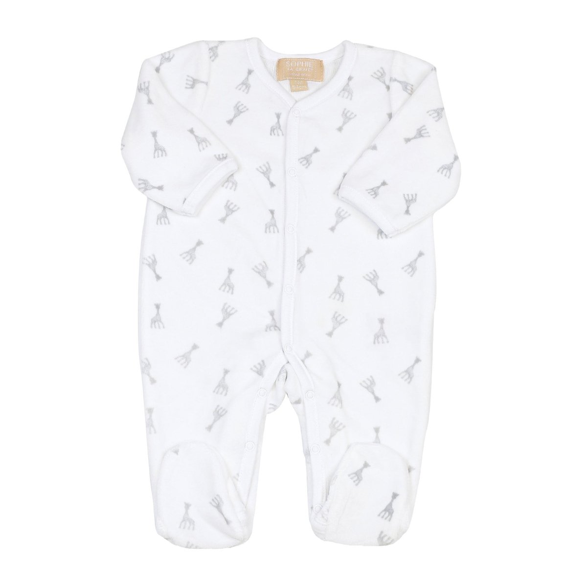 Et blødt og sødt Sophie de giraf playsuit! Denne fløjlsdragt er hvid og har lange ærmer og fødder. Trykknapper i fuld længde op til fødderne gør det ekstra nemt at skifte tøj. Størrelser: 0 måneder: 50 cm; 1 måned: 54 cm; 3 måneder: 60 cm. Materiale: 75 % økologisk bomuld og 25 % polyester. Vaskeanvisning: Vaskes på vrangen ved 30 grader med lignende farver. Mærke: Trois Kilos Sept