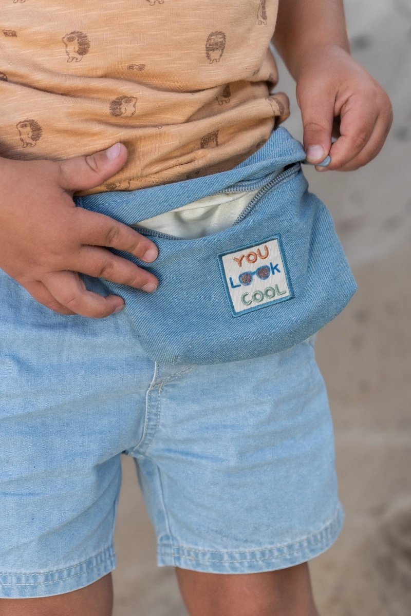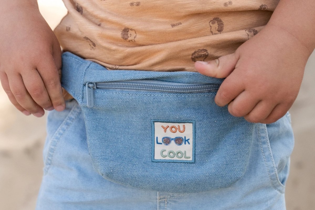 Til små skatte og store eventyr: Denne hippe taske i blød denim er en cool og praktisk tilføjelse til ethvert outfit. Lynlåsen foran holder godbidderne i sikkerhed, mens det trykte mærke giver et legende touch. Takket være den justerbare rem med solidt spænde bliver tasken siddende, mens man leger. Tasken er lavet af 100 % økologisk bomuld og Oeko-Tex-certificeret, så den er et slidstærkt og behageligt valg.
