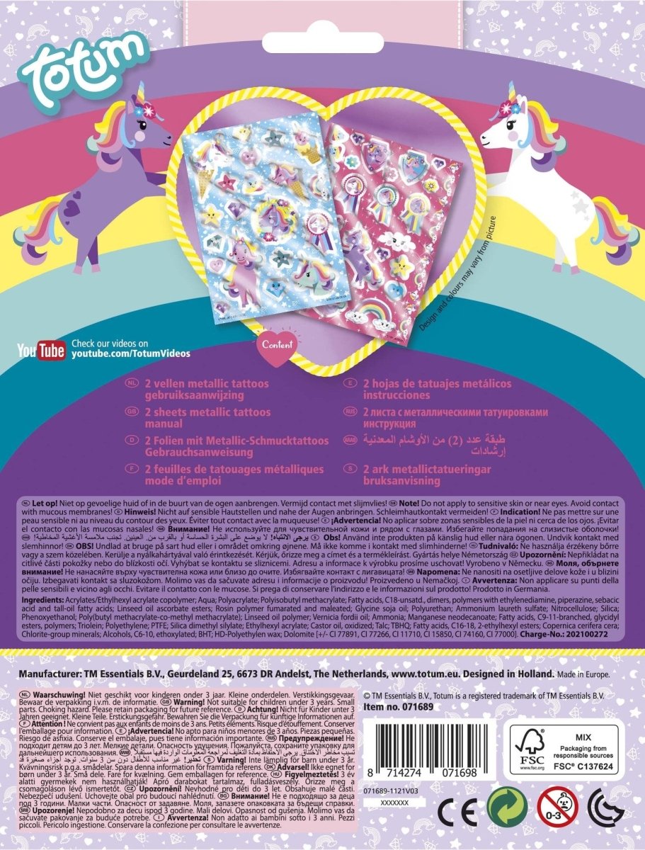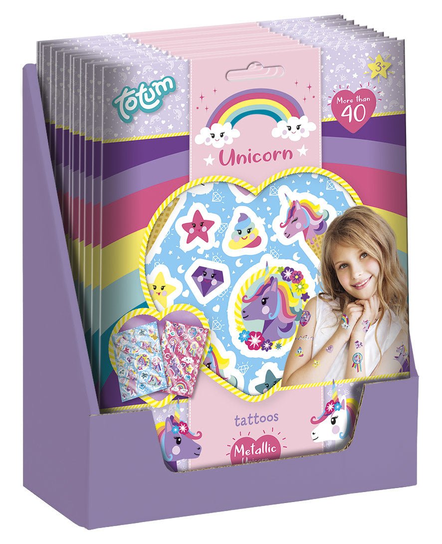Disse 40 metalliske tatoveringer i glade farver kan bruges sikkert på din hud. Brug dem til en børnefest, festival eller en sjov udklædningsfest. - Til børn fra 3 år - 40 vaskbare tatoveringer - Luksus metallisk design i mange forskellige farver - Enhjørning tema inkluderet - Sikkert for børns hud